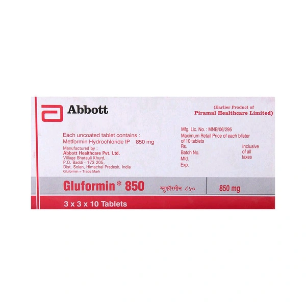 GLUFORMIN 850MG TABLET is used to treat type 2 diabetes. It contains Metformin, which works by decreasing the amount of glucose absorbed from the food and the amount of glucose made by the liver. It also increases the body's response to insulin, a natural substance that controls the amount of glucose in the blood. Thereby, it helps control the amount of glucose (sugar) in the blood. In some cases, it may cause side effects like nausea, vomiting, diarrhoea, abdominal pain, and loss of appetite. Before taking this medicine, you should tell your doctor if you are allergic to any of its components or if you are pregnant/breastfeeding, and about all the medications you are taking and pre-existing medical conditions.