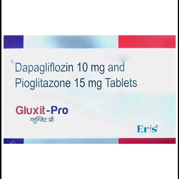 Gluxit-Pro tablet is a prescription medication designed to manage type 2 diabetes mellitus by combining dapagliflozin (10mg) and pioglitazone (15mg). It lowers high blood sugar levels by reducing glucose reabsorption in the kidneys and improving insulin response, which helps prevent complications like heart disease and kidney damage.