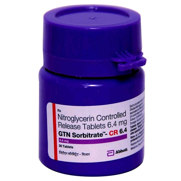 Gtn Sorbitrate CR 6.4 Tablet is used to treat Angina (heart-related chest pain). It contains Glyceryl Trinitrate, which works by relaxing the blood vessels and decreasing the oxygen demand the heart requires. As a result, it reduces heart workload and prevents attacks of Angina. Common side effects of Gtn Sorbitrate CR 6.4 Tablet may include dry mouth, blurred vision, insomnia, headache, dizziness, weakness, heart palpitations, low blood pressure upon rising from a seated position, nausea and vomiting, sweating, and flushing (warm or red condition of your skin)