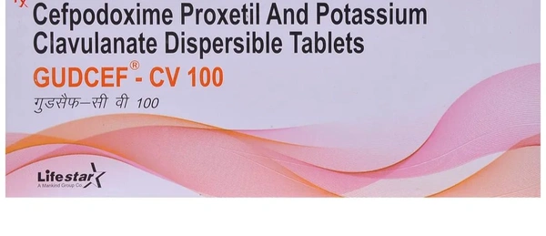Gudcef CV 100 mg Tablet is used to treat various bacterial infections such as pharyngitis/tonsillitis (throat infections), otitis media (ear infections), sinusitis (infection of the sinuses), community-acquired pneumonia, gonorrhoea (sexually transmitted disease), anorectal infections in women, skin, and urinary tract infections. It contains Cefpodoxime and Clavulanic acid, which kills the bacteria and helps to treat bacterial infections. In some cases, you may experience certain common side effects, such as diarrhoea, abdominal pain, nausea, and vomiting. Before taking this medicine, you should tell your doctor if you are allergic to any of its components or if you are pregnant/breastfeeding, and about all the medications you are taking and pre-existing medical conditions.