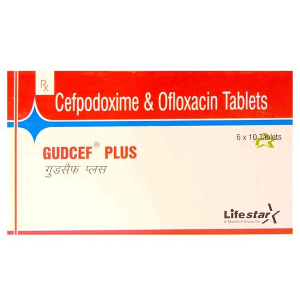 GUDCEF PLUS TABLET is a combination of Cefpodoxime and Ofloxacin which belongs to the group of medicines called Antibiotics. GUDCEF PLUS TABLET is used to manage mild to moderate bacterial infections such as acute otitis media, pharyngitis, and sinusitis.