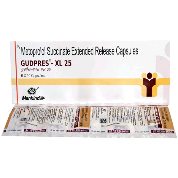 Gudpres-XL 25 Capsule is used to treat high blood pressure (hypertension), heart-related chest pain (angina), irregular heart rhythm (arrhythmia), and to protect the heart after a heart attack (myocardial infarction). Besides this, it may also help in relieving symptoms of migraine-related headache and tremors (fits). It contains Metoprolol, which helps in slowing down the heart rate, making it easier for the heart to pump blood throughout the body. This lowers the blood pressure and helps in reducing the risk of having a stroke, heart attack, or other heart or kidney problems in the future. In some cases, it may cause certain common side effects like dizziness, tiredness, diarrhoea, stomach pain, nausea, and headache. Before taking this medicine, you should tell your doctor if you are allergic to any of its components or if you are pregnant/breastfeeding, and about all the medications you are taking and pre-existing medical conditions.