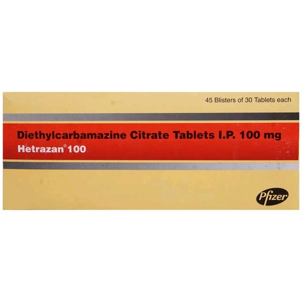 Hetrazan 100 Tablet is indicated for the treatment of certain parasitic infections, including Bancroft's filariasis, Eosinophilic lung, Loiasis, and River blindness. It contains Diethylcarbamazine, which works by killing the worms that cause infections. Therefore, it helps treat certain parasitic infections and their associated symptoms. It may cause side effects like itching, swelling of the face, especially near the eyes, tightness in the chest or throat, wheezing, feeling sleepy, and nervousness. Before taking this medicine, you should tell your doctor if you are allergic to any of its components or if you are pregnant/breastfeeding, and about all the medications you are taking and pre-existing medical conditions