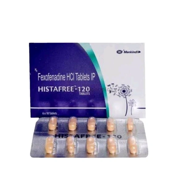 Histafree-120 Tablet is used to treat various kinds of allergies. It contains Fexofenadine, which blocks the effects of a chemical messenger known as histamine, that is naturally involved in allergic reactions. It is widely used to treat hay fever (an allergy caused by pollen or dust), conjunctivitis (red, itchy eye), eczema (dermatitis), hives (red, raised patches or dots), reactions to insect bites and stings and some food allergies. In some cases, you may experience headaches, nausea, or dizziness. Before taking this medicine, you should tell your doctor if you are allergic to any of its components or if you are pregnant/breastfeeding, and about all the medications you are taking and pre-existing medical conditions. Do not take this medicine with dairy products as it may lower its efficacy.