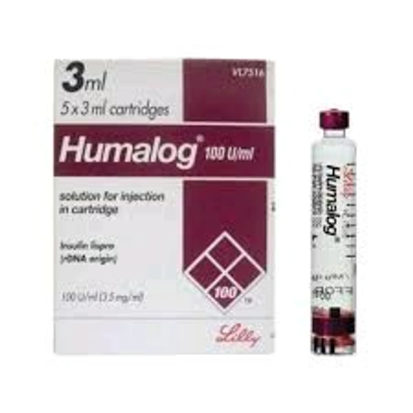 Humalog 100IU/ml Solution for Injection 5 x 3 ml is used to treat type 1 and type 2 diabetes mellitus. It contains Insulin lispro, which works similar to the insulin produced by the body. It stops the liver from producing more sugar and also helps move the sugar from the blood into other body tissues where it can be used for energy. Thereby, it helps control blood sugar levels. In some cases, you may experience injection site reactions like redness or swelling. You may also experience symptoms of hypoglycaemia and low blood sugar) such as cold sweat, cool pale skin, nervousness or tremor, anxious feeling, unusual tiredness or weakness, confusion, difficulty in concentration, drowsiness, excessive hunger, temporary vision changes, headache, nausea, and palpitation (very high heartbeat)