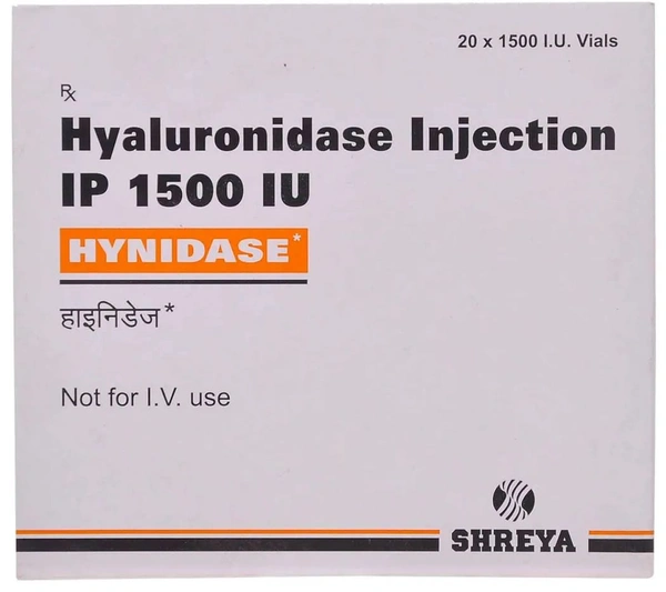 Hynidase 1500IU Injection is used to improve the absorption of injections. It contains Hyaluronidase which works by increasing the permeability of connective tissue through hyaluronic acid hydrolysis. In some cases, this medicine may cause side effects such as swelling, irritation, or bruising at the injection site. Inform the doctor if you are pregnant or breastfeeding, taking any other medication, or have any pre-existing medical conditions