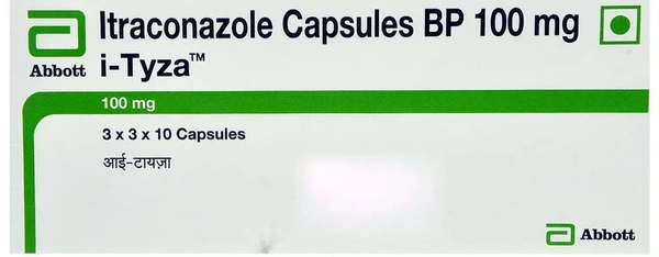 I-Tyza Capsule is an antifungal medicine used to treat fungal infections of the mouth, throat, toenails, fingernails or lungs. It contains Itraconazole, which works by killing fungi. Some people may experience side effects such as nausea, headache, diarrhoea, tiredness, cough, cold, throat pain, back pain and stomach pain. Before taking this medicine, you should tell your doctor if you are allergic to any of its components or if you are pregnant/breastfeeding, and about all the medications you are taking and pre-existing medical conditions.