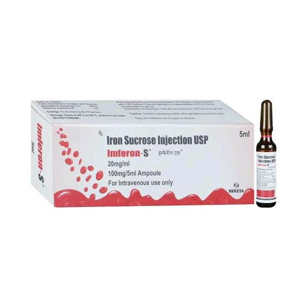 Imferon S 20mg Injection is an iron replacement product. It is used to treat a type of anemia in which the number of red blood cells is less due to a low level of iron in your body (iron-deficiency anemia). Iron is needed to produce the red blood cells that carry oxygen around your body.