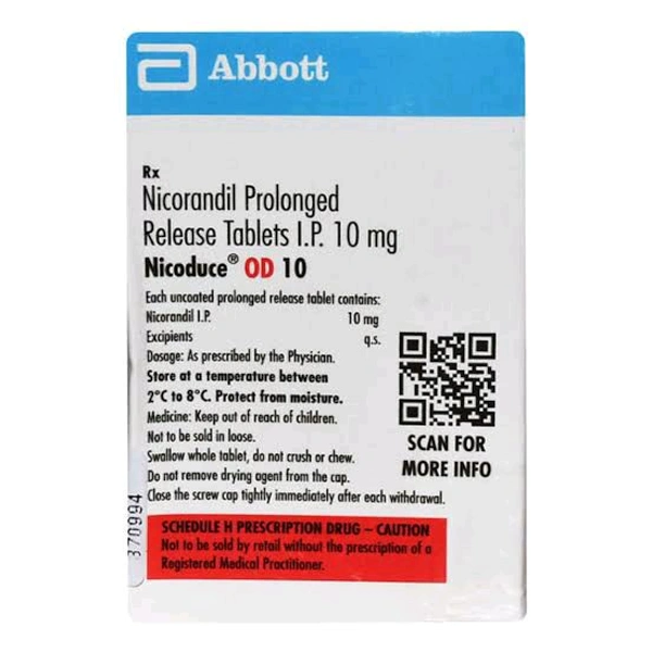 Nicoduce OD 10mg Tablet is a medicine used to prevent and treat heart-related chest pain (angina). It is usually prescribed when other heart medicines are either not suitable or have not worked. It reduces the risk of an angina attack by widening blood vessels and improving blood flow to the heart.