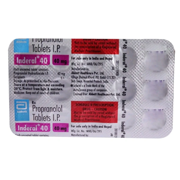 Inderal 40 Tablet is used alone or together with other medicines to treat high blood pressure (hypertension), heart-related chest pain (angina), heart rhythm disorder (arrhythmia) and preventing symptoms of migraine headache and tremors (fits). It contains Propranolol, which plays a vital role in relaxing our blood vessels by blocking the action of certain natural substances in your body. This lowers the blood pressure and helps reduce the risk of stroke, heart attack, other heart problems or kidney problems in the future. It may cause common side effects like feeling dizzy or exhausted, cold hands or feet, difficulty sleeping, and nightmares