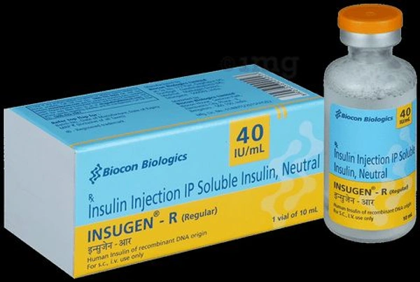 Insugen-R 40IU/ml Solution for Injection is a short-acting insulin used to treat type 1 and type 2 diabetes mellitus. It is used together with a healthy diet and regular exercise to control blood sugar levels after meals. This helps to prevent serious complications of diabetes like kidney damage and blindness.