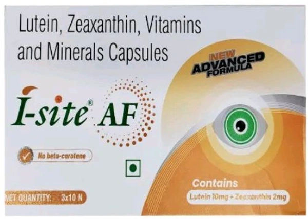 I-Site AF capsule is a nutritional supplement used to optimize eye health in adults. It is used to prevent eye diseases such as cataracts, glaucoma, and age-related macular degeneration (age related vision loss