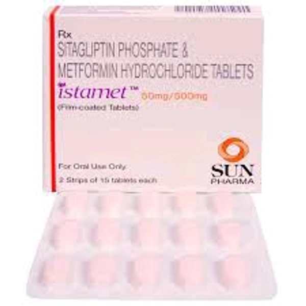 Istamet 50mg/500mg Tablet is a combination medication containing Sitagliptin and Metformin. It is primarily used for managing type 2 diabetes mellitus by improving blood sugar control in adults. This tablet helps regulate blood sugar levels effectively when diet and exercise alone are insufficient.