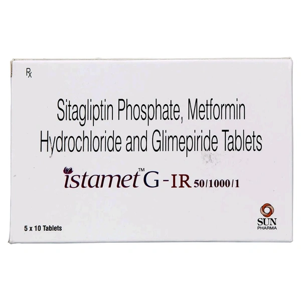 Istamet G-IR 50/1000/1 Tablet is an antidiabetic medicine used to treat type II diabetes. It contains Metformin (biguanides), which works by reducing the sugar production by cells in the liver and delays sugar absorption from the intestine. Sitagliptin (dipeptidyl peptidase-4 inhibitor) works by increasing the amounts of certain natural substances that lower blood sugar when it is high. Glimepiride (sulfonylureas) works by stimulating beta cells in the pancreas that produce insulin, which helps to remove sugar from the blood.