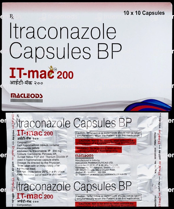 IT-Mac 200 Capsule is an antifungal medicine used to treat fungal infections of the mouth, throat, toenails, fingernails or lungs. It contains Itraconazole, which works by killing fungi. Some people may experience side effects such as nausea, headache, diarrhoea, tiredness, cough, cold, throat pain, back pain and stomach pain. Before taking this medicine, you should tell your doctor if you are allergic to any of its components or if you are pregnant/breastfeeding, and about all the medications you are taking and pre-existing medical conditions.