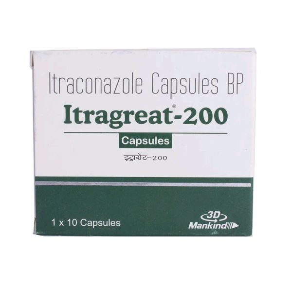 Itragreat-200 Capsule is an antifungal medicine used to treat fungal infections of the mouth, throat, toenails, fingernails or lungs. It contains Itraconazole, which works by killing fungi. Some people may experience side effects such as nausea, headache, diarrhoea, tiredness, cough, cold, throat pain, back pain and stomach pain. Before taking this medicine, you should tell your doctor if you are allergic to any of its components or if you are pregnant/breastfeeding, and about all the medications you are taking and pre-existing medical conditions.