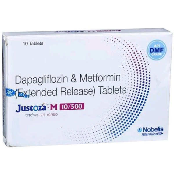 Justoza-M 10/500 Tablet is used to treat type 2 diabetes mellitus. It contains Metformin and Dapagliflozin which work by eliminating excess sugars from the body through urine and restoring the body’s response to insulin. In some cases, this medicine may cause side effects such as nausea, vomiting, diarrhoea, headache, and dizziness. Before taking this medicine, inform the doctor if you are pregnant or breastfeeding, taking any other medication, or have any pre-existing medical conditions.