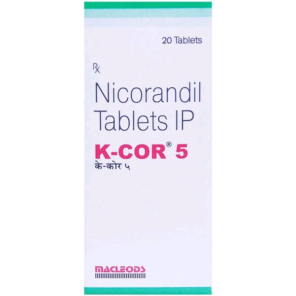 K-Cor 5 Tablet is used to treat angina pectoris (heart-related chest pain). It contains Nicorandil which works by widening blood vessels and reducing the heart's workload by making it easier for the heart to pump blood around the body. In some cases, this medicine may cause side effects such as headache, nausea, vomiting, dizziness, and weakness. Inform the doctor if you are pregnant or breastfeeding, taking any other medication, or have any pre-existing medical conditions.