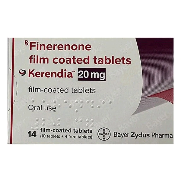 Kerendia 20 mg Tablet is used to treat Chronic kidney disease (CKD). It contains the active substance finerenone. It works by blocking the action of certain hormones (mineralocorticoids) that can damage your kidneys and heart. Common side effects of Kerendia 20 mg Tablet may include high potassium level (hyperkalaemia), weakness or tiredness, feeling sick (nausea), numbness in the hands and lips, decreased pulse rate, low sodium level (hyponatraemia), fatigue, headache, confusion, muscle weakness, spasms or cramps and high uric acid level (hyperuricaemia).