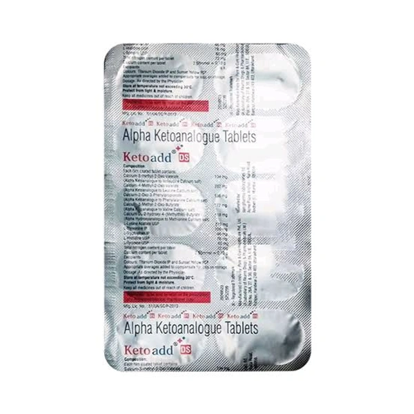 Ketoadd DS Tablet is a nutritional supplement used in the treatment of chronic kidney disease. It reduces urea levels in the blood and helps prevent the progression of kidney disease. This way it delays the risk of undergoing long-term dialysis.
