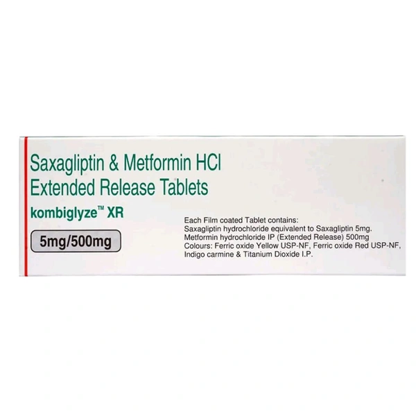 Kombiglyze XR 5mg/500mg Tablet is used to treat type 2 diabetes. It contains Saxagliptin and Metformin which work by lowering the liver's glucose production, delaying glucose absorption from the intestines, and increasing the body's response to insulin. In some cases, this medicine may cause side effects such as low blood glucose levels, upper respiratory tract infection and headache. Inform the doctor if you are pregnant or breastfeeding, taking any other medication, or have any pre-existing medical conditions.