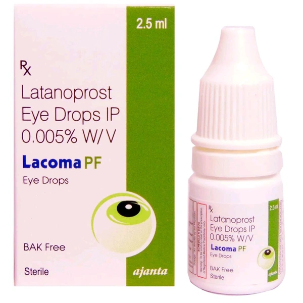 Lacoma PF Eye Drops is used to lower the intraocular pressure in patients with glaucoma or ocular hypertension. It contains Latanoprost, which works by increasing the natural flow of liquid from inside your eye into your bloodstream. This lowers the pressure within your eye and stops your sight from worsening. In some cases, you may experience side effects such as changes in your eye colour, blurred vision, changes in the thickness, length, or colour of your eyelashes, irritation, and dry eyes. Before using this medicine, you should tell your doctor if you are allergic to any of its components or if you are pregnant/breastfeeding, and about all the medications you are taking and pre-existing medical conditions.