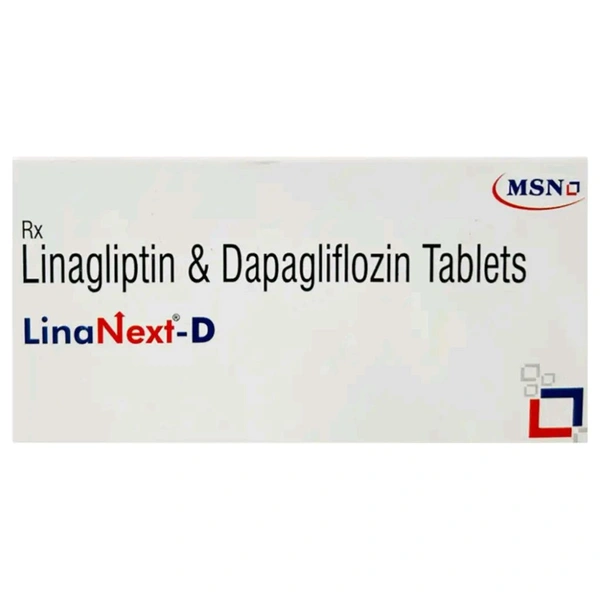 Linanext-D Tablet is an antidiabetic medicine used to treat Type II Diabetes. It contains Dapagliflozin (sodium-glucose cotransporter-2 inhibitors) and Linagliptin (dipeptidyl peptidase-4 inhibitor). It reduces the sugar production by liver cells and delays sugar absorption from the intestines. Thus, It helps control blood sugar levels. Linanext-D Tablet may cause side effects such as diarrhoea, headache, dizziness, hypoglycaemia, nausea, and vomiting.
