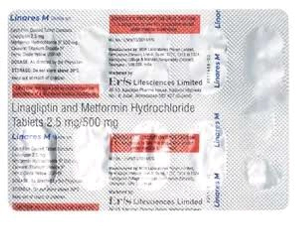 Linato M 2.5 mg/500 mg Tablet 10's is used to treat Type 2 Diabetes. It contains Linagliptin and Metformin, which help the body produce more insulin only when required. It also reduces the amount of sugar produced by the liver when not needed. Also, it lowers glucose production in the liver, delays glucose absorption from the intestines and increases the body's sensitivity to insulin. Thus, it prevents blood glucose levels from rising to very high levels after meals. It may cause common side effects such as hypoglycemia (low blood glucose levels) characterised by dizziness, sweating, palpitations, hunger pangs, dry mouth, skin, etc. So to avoid hypoglycemia, you should not miss meals and should carry some form of sugar along with you. Other side effects include taste change, nausea, diarrhoea, stomach pain, headache, and upper respiratory symptoms.