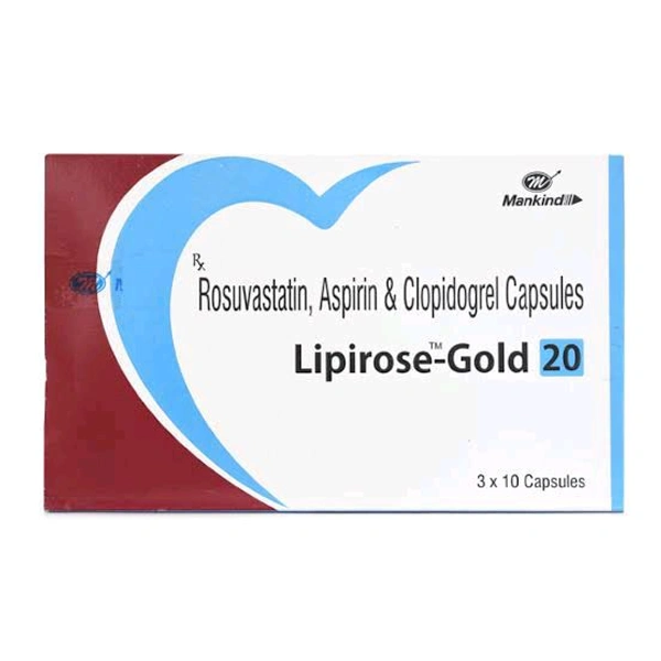 Lipirose-Gold 20 Capsule is used to treat heart attack, myocardial infarction (blockage of the blood to muscles of the heart), angina (chest pain), and stroke. It lowers the level of lipids and blocks the ability of the body to produce bad cholesterol and improves the ability of the body to make good cholesterol. It works by preventing the blood from sticking together and decreasing the production of clots which is harmful to the body. In some cases, it may cause side effects like headache, muscle pain, increased bleeding, stomach pain, indigestion, bruise (discolouration of the skin), bleeding in the nose, weakness, gastrointestinal bleeding, diarrhea, and nausea. Before taking this medicine, you should tell your doctor if you are allergic to any of its components or if you are pregnant/breastfeeding, and about all the medications you are taking and pre-existing medical conditions.