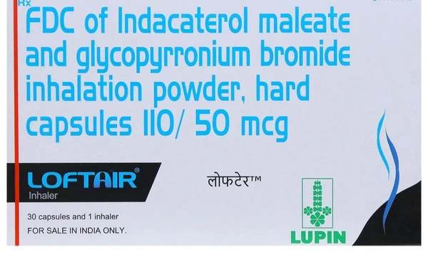 Loftair 110/50 mcg Inhaler with 30 Capsules is a combination medicine used for long-term maintenance in patients with Chronic Obstructive Pulmonary Disease (COPD), including emphysema and/or chronic bronchitis. This medicine contains glycopyrronium and indacaterol, which works by relaxing the muscles around the airways and making it easier to breathe. Common side effects include headache, nausea, dry mouth, chest pain, muscle cramps, dizziness, painful and frequent urination.