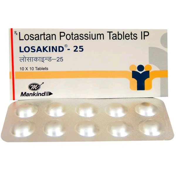 Losakind 25 Tablet is used to treat high blood pressure (hypertension), chronic heart failure, and diabetic nephropathy. It is also used to decrease the risk of stroke in people who have high blood pressure and a heart condition called left ventricular hypertrophy (enlargement of the walls of the left side of the heart). It contains Losartan, which works by blocking the action of certain natural substances that tighten the blood vessels, allowing the blood to flow more smoothly and the heart to pump more efficiently. In some cases, you may experience dizziness, tiredness, low blood pressure, weakness, anaemia (lack of blood), hyperkalaemia (high potassium levels in the blood), change in kidney function, orthostatic hypotension (low blood pressure when standing up from lying or sitting position) or hypoglycaemia (low blood sugar).