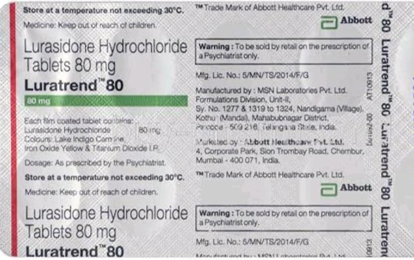 Luratrend 80Mg Tablet is used to treat schizophrenia and bipolar disorder. It contains Lurasidone which works by blocking neurotransmitters and helps regulate mood, thoughts and behaviour. In some cases, this medicine may cause side effects such as nausea, vomiting, sleepiness, weight gain, indigestion, dry mouth, and restlessness. Inform the doctor if you are pregnant or breastfeeding, taking any other medication, or have any pre-existing medical conditions.