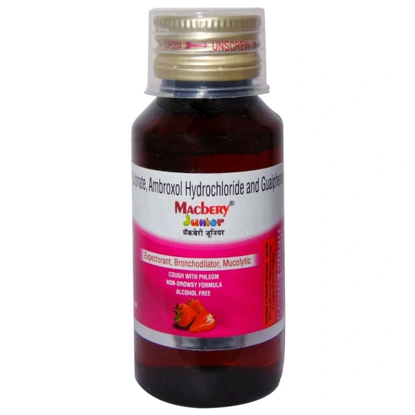 Macbery Junior Expectorant is used to treat cough associated with mucus. It works by relaxing muscles and widening the airways of the lungs. It thins and loosens phlegm (mucus) in the lungs, windpipe, and nose. Thereby, helping to cough out easily. It works by increasing the volume of fluid in the airways, reducing the stickiness of mucus, and helping to remove it from the airways. Some people may experience nausea, vomiting, drowsiness, headache, dizziness, skin rash, tremor, stomach upset and diarrhoea. Before taking this medicine, you should tell your doctor if you are allergic to any of its components or if you are pregnant/breastfeeding, and about all the medications you are taking and pre-existing medical conditions.