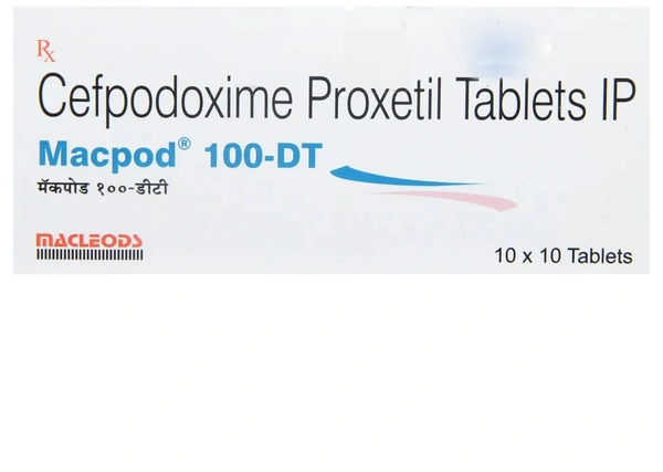 Macpod 100-DT Tablet is used to treat bacterial infections such as respiratory tract infections, including infections of the lungs, throat, tonsils, and sinus cavities in children. It contains Cefpodoxime proxetil, which is a broad-spectrum antibiotic effective against both gram-positive and gram-negative bacteria. It works by preventing the formation of bacterial cell covering (cell wall), which is necessary for their survival. Thereby, it kills the bacteria and helps in treating bacterial infections