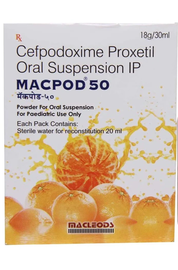 Macpod 50 mg Suspension is used to treat bacterial infections such as respiratory tract infections, including infections of the lungs, throat, tonsils, and sinus cavities in children. It contains Cefpodoxime proxetil, which is a broad-spectrum antibiotic effective against both gram-positive and gram-negative bacteria. It works by preventing the formation of bacterial cell covering (cell wall), which is necessary for their survival. Thereby, it kills the bacteria and helps in treating bacterial infections.