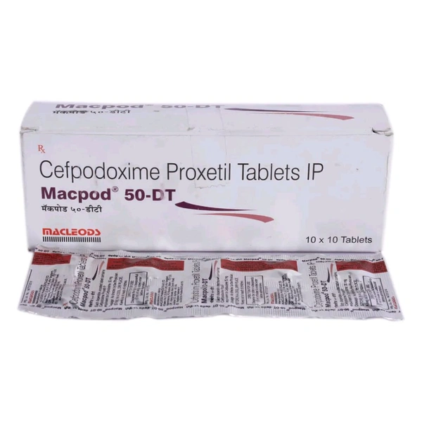 Macpod 50-DT Tablet is used to treat bacterial infections such as respiratory tract infections, including infections of the lungs, throat, tonsils, and sinus cavities in children. It contains Cefpodoxime proxetil, which is a broad-spectrum antibiotic effective against both gram-positive and gram-negative bacteria. It works by preventing the formation of bacterial cell covering (cell wall), which is necessary for their survival. Thereby, it kills the bacteria and helps in treating bacterial infections.
