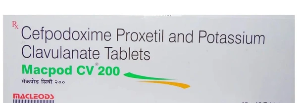 Macpod CV 200 Tablet is used to treat various bacterial infections such as pharyngitis/tonsillitis (throat infections), otitis media (ear infections), sinusitis (infection of the sinuses), community-acquired pneumonia, gonorrhoea (sexually transmitted disease), anorectal infections in women, skin, and urinary tract infections. It contains Cefpodoxime and Clavulanic acid, which kills the bacteria and helps to treat bacterial infections. In some cases, you may experience certain common side effects, such as diarrhoea, abdominal pain, nausea, and vomiting. Before taking this medicine, you should tell your doctor if you are allergic to any of its components or if you are pregnant/breastfeeding, and about all the medications you are taking and pre-existing medical conditions.