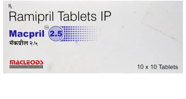 Macpril 2.5 Tablet is used to treat high blood pressure (hypertension) and reduce the risk of having a heart attack, stroke or heart failure. It contains Ramipril, which relaxes and widens the blood vessels, making it easier for the heart to pump blood to all parts of the body, thereby lowering the raised blood pressure and reducing the risk of having a heart attack, stroke or heart failure. In some cases, it may cause common side effects like headache, dizziness, fatigue, and cough. Before taking this medicine, you should tell your doctor if you are allergic to any of its components or if you are pregnant/breastfeeding, and about all the medications you are taking and pre-existing medical conditions.