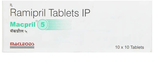 Macpril 5 Tablet is used to treat high blood pressure (hypertension) and reduce the risk of having a heart attack, stroke or heart failure. It contains Ramipril, which relaxes and widens the blood vessels, making it easier for the heart to pump blood to all parts of the body, thereby lowering the raised blood pressure and reducing the risk of having a heart attack, stroke or heart failure. In some cases, it may cause common side effects like headache, dizziness, fatigue, and cough. Before taking this medicine, you should tell your doctor if you are allergic to any of its components or if you are pregnant/breastfeeding, and about all the medications you are taking and pre-existing medical conditions.