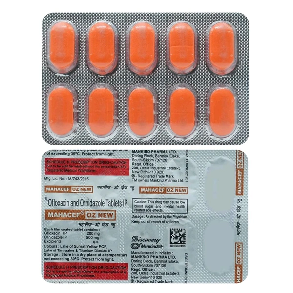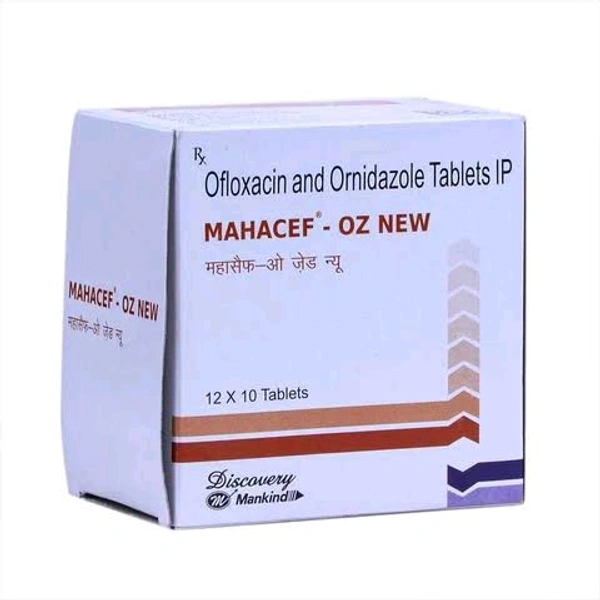 Mahacef-OZ New Tablet is used to treat bacterial infections of the urinary tract, bacterial infections by inflammation of the peritoneum, eye and ear infections, skin and soft tissue infections, sexually transmitted infections, respiratory infections, vaginal infections, protozoan infections, intra-abdominal infections, and infections during surgical procedures. It is also indicated in the treatment of diarrhoea of mixed infections in adults. It contains Ofloxacin and Ornidazole, which stops the growth of infection causing organisms. In some cases, it may cause side effects such as nausea, vomiting, abdominal pain, headache, and dizziness. Before taking this medicine, you should tell your doctor if you are allergic to any of its components or if you are pregnant/breastfeeding, and about all the medications you are taking and pre-existing medical conditions
