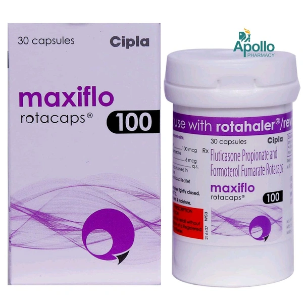 Maxiflo 100 Rotacap is used in the treatment of asthma (wheezing and shortness of breath) and chronic obstructive pulmonary disorder (a lung disorder in which the flow of air to the lungs is blocked). It relaxes the muscles of the air passages and making it easier to breathe.