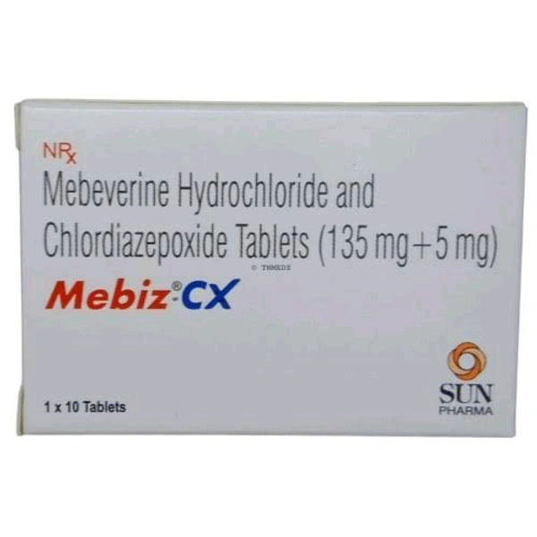 Mebiz-CX Tablet 10's is used to treat painful stomach cramps in the condition of irritable bowel syndrome (IBS) with bloating. It contains Mebeverine and Chlordiazepoxide, which works by relaxing the intestinal muscle wall, thereby providing relief from painful muscle spasms. Also, it decreases the abnormal activity of nerve cells. Thus, it relaxes intestinal muscles, reduces stomach pain caused by spasms, cramps, gas formation, and bloating, and minimizes anxiety levels caused due to stomach discomfort. In some cases, it may cause side effects such as drowsiness, dizziness, light-headedness, slurred speech, tiredness, lack of coordination, or difficulty in controlling movements. Before taking this medicine, you should tell your doctor if you are allergic to any of its components or if you are pregnant/breastfeeding, and about all the medications you are taking and pre-existing medical conditions.