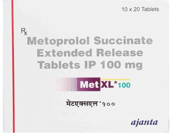 Met XL 100 Tablet is used to treat high blood pressure (hypertension), heart-related chest pain (angina), irregular heart rhythm (arrhythmia), and to protect the heart after a heart attack (myocardial infarction). Besides this, it may also help in relieving symptoms of migraine-related headache and tremors (fits). It contains Metoprolol, which helps in slowing down the heart rate, making it easier for the heart to pump blood throughout the body. This lowers the blood pressure and helps in reducing the risk of having a stroke, heart attack, or other heart or kidney problems in the future. In some cases, it may cause certain common side effects like dizziness, tiredness, diarrhoea, stomach pain, nausea, and headache. Before taking this medicine, you should tell your doctor if you are allergic to any of its components or if you are pregnant/breastfeeding, and about all the medications you are taking and pre-existing medical conditions.