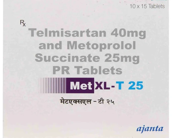 Met XL T 25 Tablet is used to treat hypertension (high blood pressure). It may also be used to lower the risk of heart attack and stroke in future. It contains Telmisartan and Metoprolol, which relaxes the blood vessels and allows the blood to flow more smoothly. Thus, it lowers the blood pressure. In some cases, you may experience certain common side effects such as headache, nausea, dizziness, weakness, stomach pain, and slow heart rate. Before taking this medicine, you should tell your doctor if you are allergic to any of its components or if you are pregnant/breastfeeding, and about all the medications you are taking and pre-existing medical conditions.