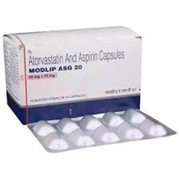 Modlip ASG 20 Capsule is a combination of two medicines used to prevent heart attack and stroke. It lowers the "bad" cholesterol (LDL) and triglycerides and raises the "good" cholesterol (HDL) levels in the body. Moreover, it also decreases the formation of blood clots.
