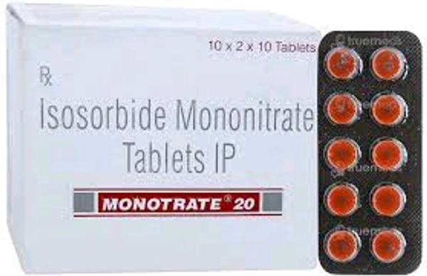 Monotrate 20 Tablet is used to prevent heart-related chest pain (angina). It works by relaxing and widening blood vessels so blood can flow more easily to the heart. This medicine will not treat an angina attack that has already begun.