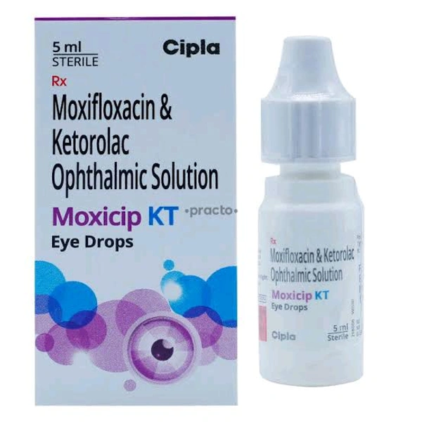 Moxicip KT Eye Drops 5 ml is an ophthalmic (for eye use) medication, primarily used to treat and prevent bacterial eye infections and itchy eyes caused by seasonal allergies. Moxicip KT Eye Drops 5 ml also relieves swelling, pain, and burning or stinging sensation after cataract surgery or corneal refractive surgery