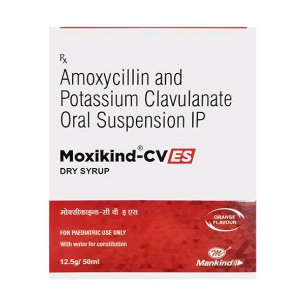 Moxikind-CV ES Orange Flavour Dry Syrup is an antibiotic medicine used to treat bacterial infections in children. It contains Amoxycillin and Clavulanic acid. Amoxycillin works by inhibiting the formation of the bacterial cell wall (a protective covering) and causing damage to the bacterial cell wall. This eventually leads to the death of the bacterial cell and thus prevents the growth of bacterial infections. Clavulanic acid inhibits the beta-lactamase enzyme, which prevents bacteria from destroying the efficacy of amoxycillin. It may cause side effects like indigestion, diarrhoea, nausea, and stomach pain.