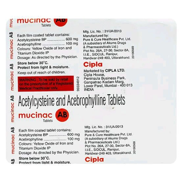 Mucinac AB Tablet belongs to the class of drugs called 'mucolytic agents' (cough/sputum thinner) primarily used to prevent and treat symptoms of chronic obstructive pulmonary disease (COPD) such as shortness of breath, coughing, or wheezing (whistling sound while breathing).