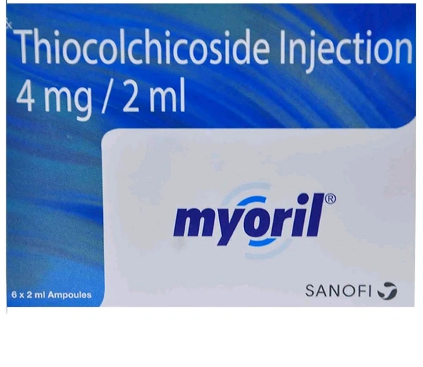 Myoril Injection 6 x 2 ml contains thiocolchicoside which belongs to the class of muscle relaxants. This medicine is used as an adjuvant in the treatment of pain due to muscular contractions brought on by dorsal pain, low back pain, torticollis (neck muscle contractions), etc. It helps relieve muscle stiffness and improves muscle movements by working on the center of spinal cord and brain.